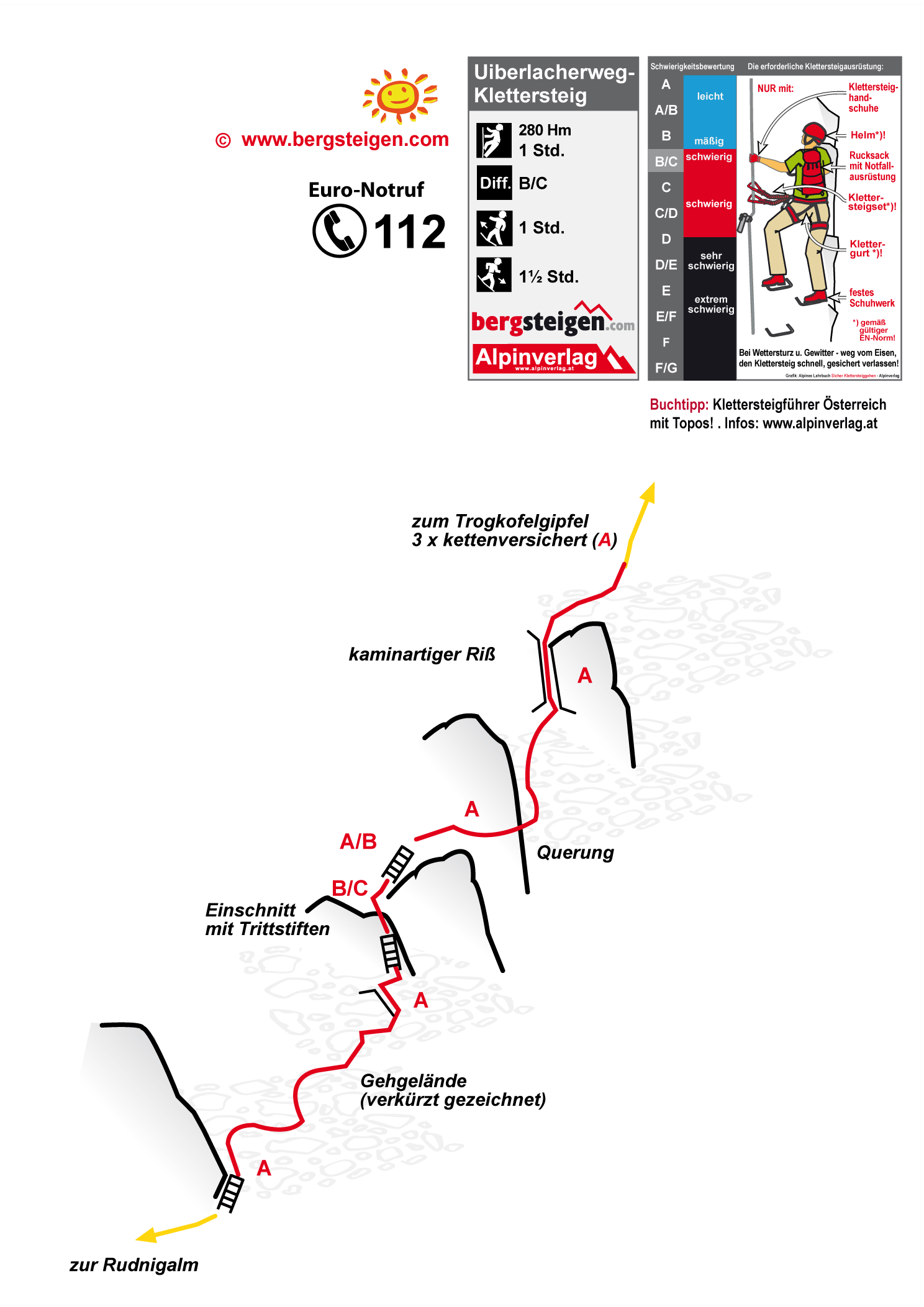 Na zejściu ze szczytu, którym też prowadzi coś na kształt ferraty (Uibelacherweg, niby B/C), spotkaliśmy najpierw ostrzeżenie, że jest to trasa dla pewnych i oswojonych z wysokością turystów. Oczywiście, nie było tak źle, jeśli chodzi o ekspozycję. Więcej problemów sprawiały drobne kamienie, na których można było się poślizgnąć. W niektórych miejscach zejście ułatwiały drabinki czy klamry.
